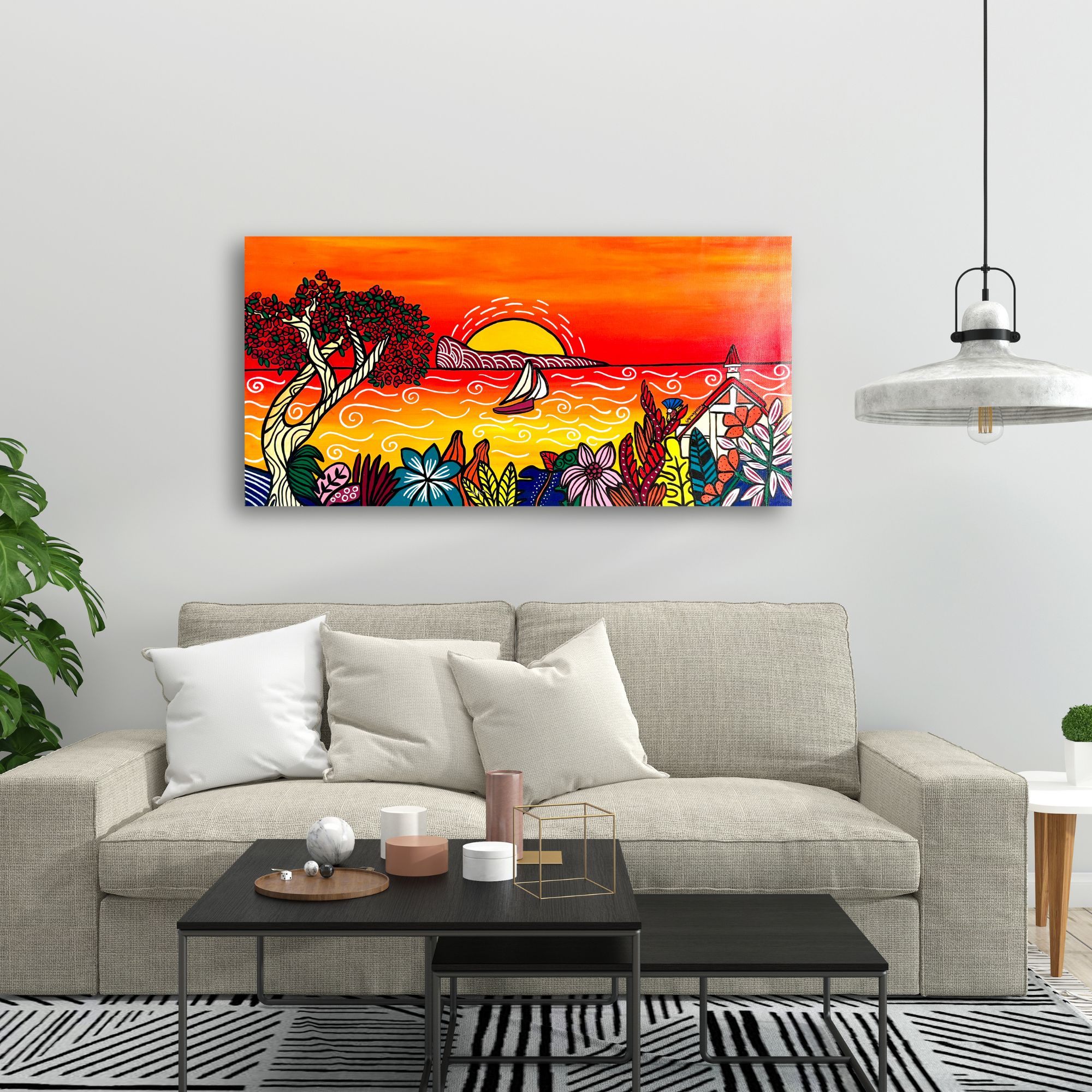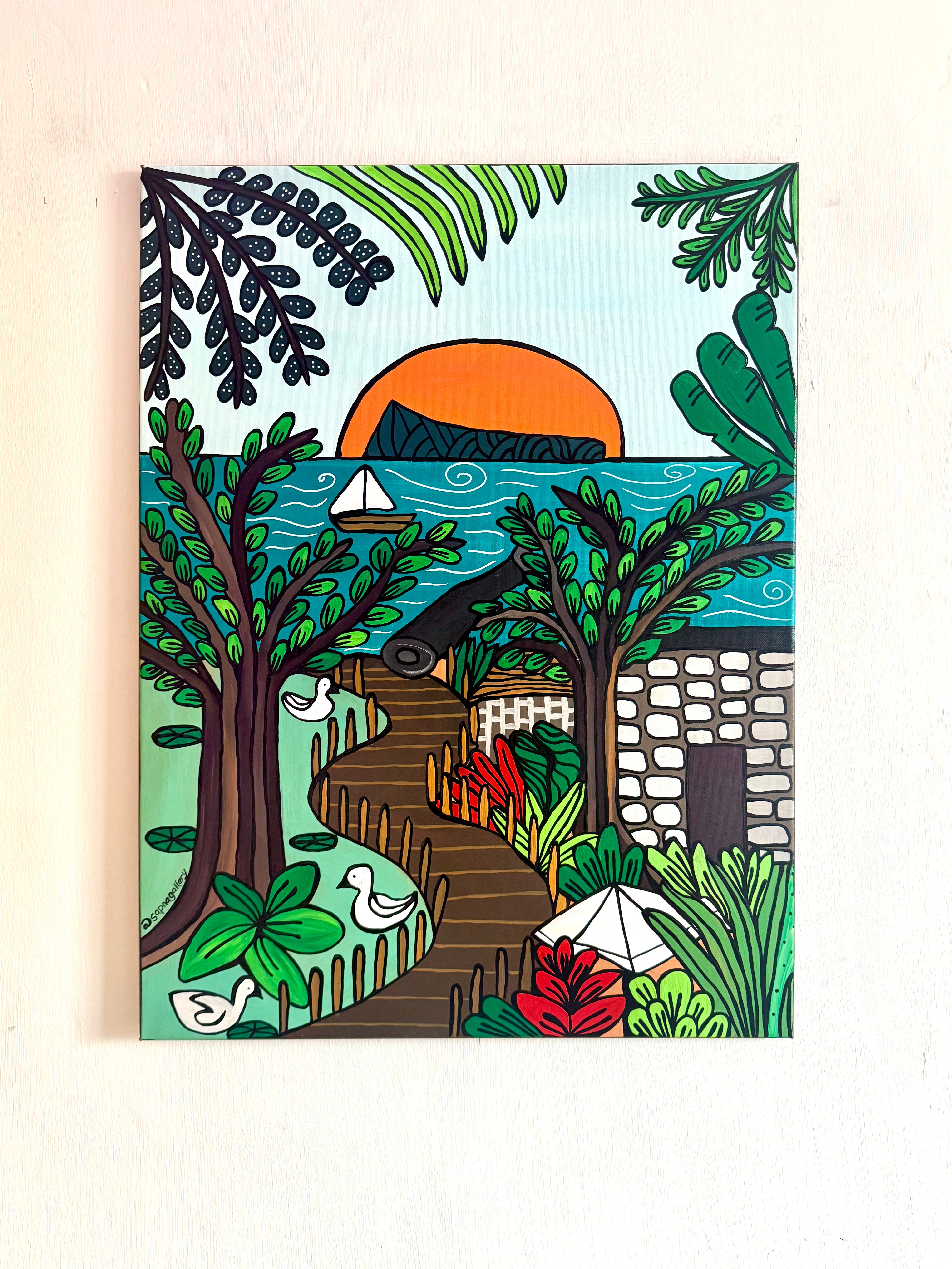The artwork brings together the soul of Canonnier—its timeless canons and ancient forts, the serene duck pond, the mangrove trees, the graceful boats, and the iconic white parasols by the sea. In the distance, Coin de Mire rises with majesty, while the warm glow of the sunset ties it all together in harmony. Each element was carefully chosen to reflect the beauty and memories of this extraordinary place.