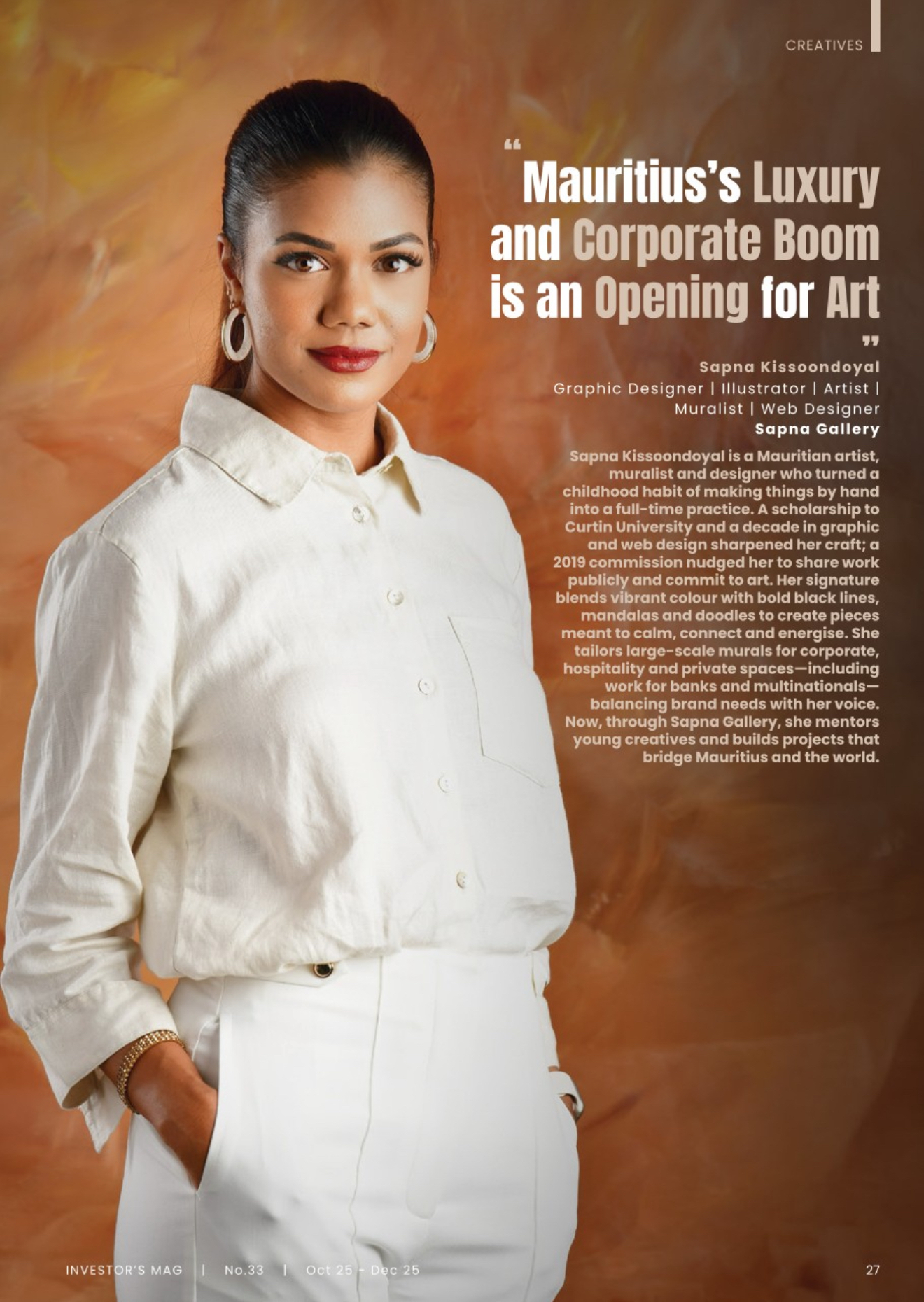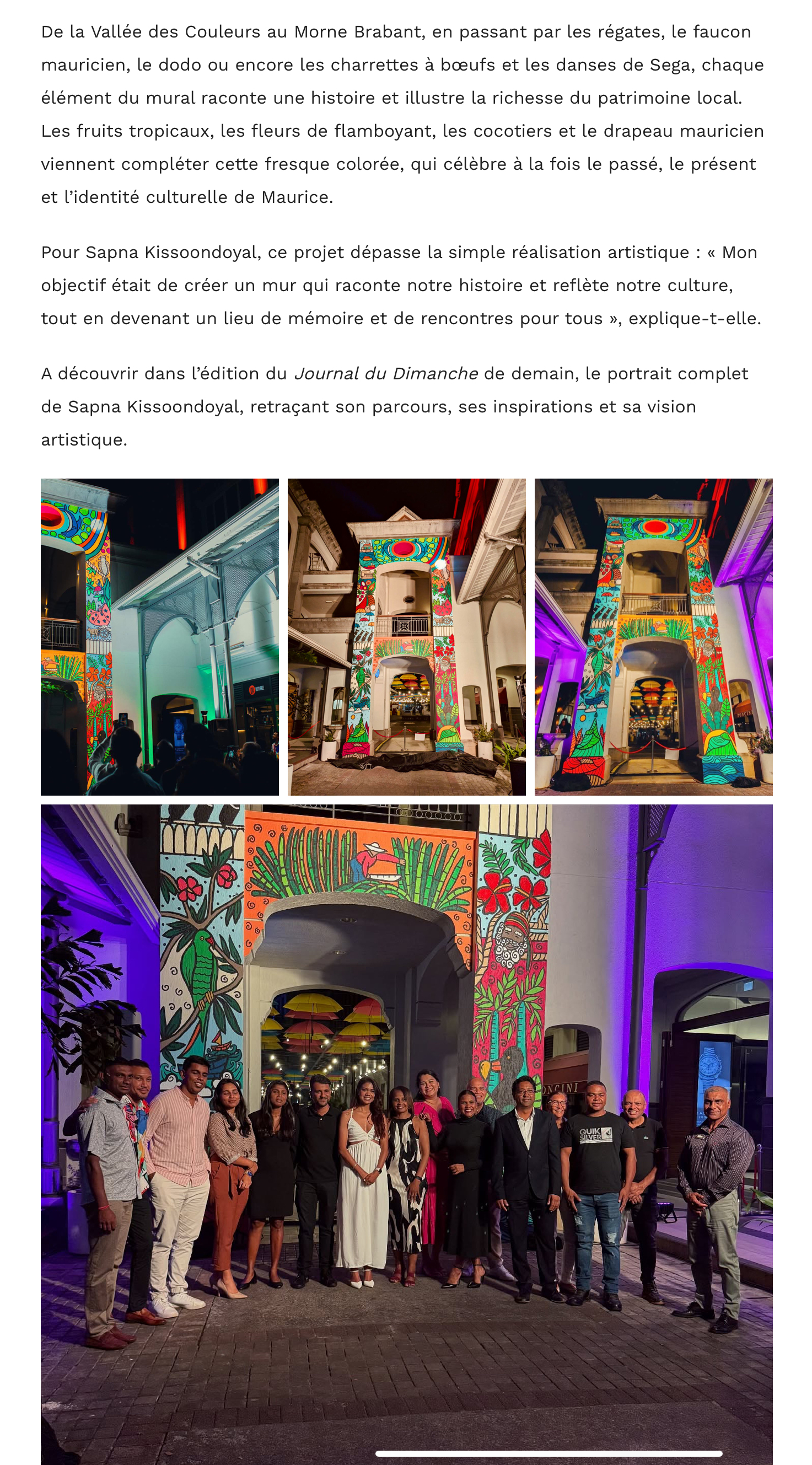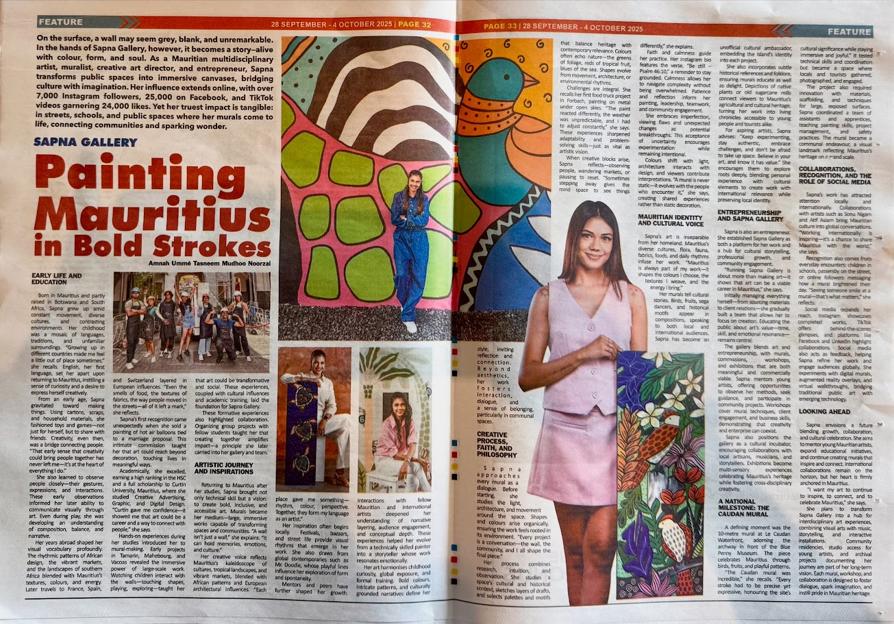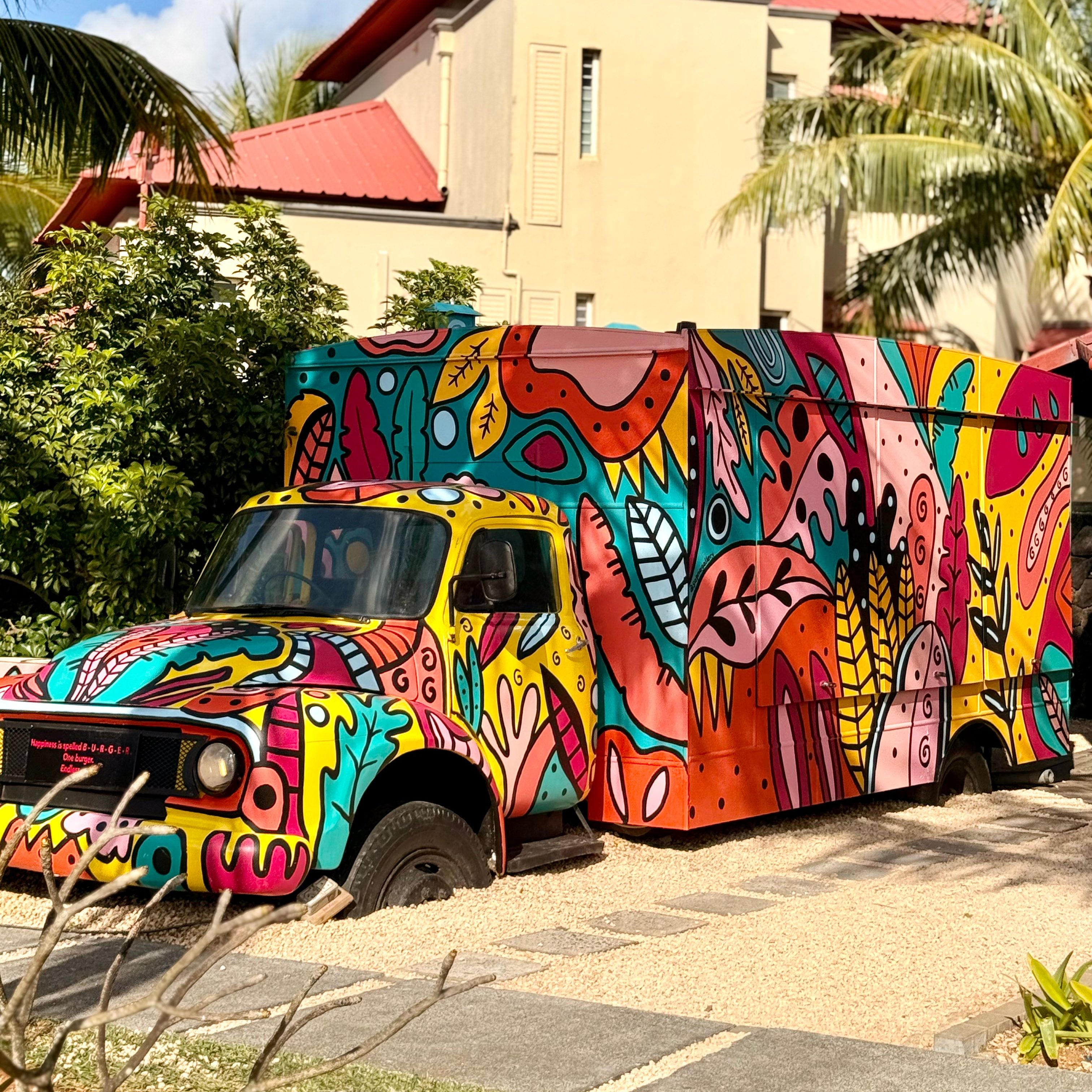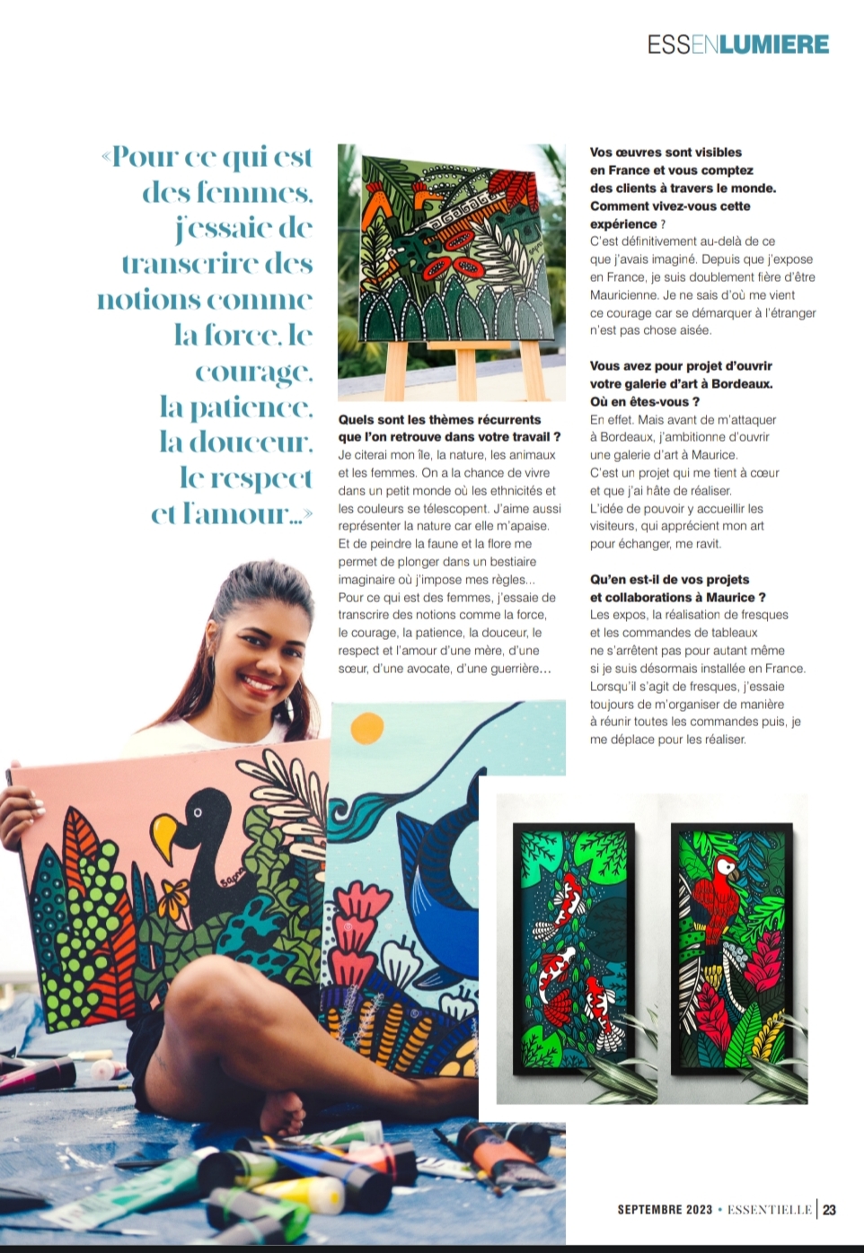 Today, I’m fortunate enough to live my dream through my acrylic paintings, murals, and illustrations. I offer design services, custom paintings, and workshops across Mauritius and internationally, constantly striving to bring positivity and vibrance to every space I touch. My work has been showcased in exhibitions in both Mauritius and France, where I’ve had the honor of sharing my artistic vision with diverse audiences.