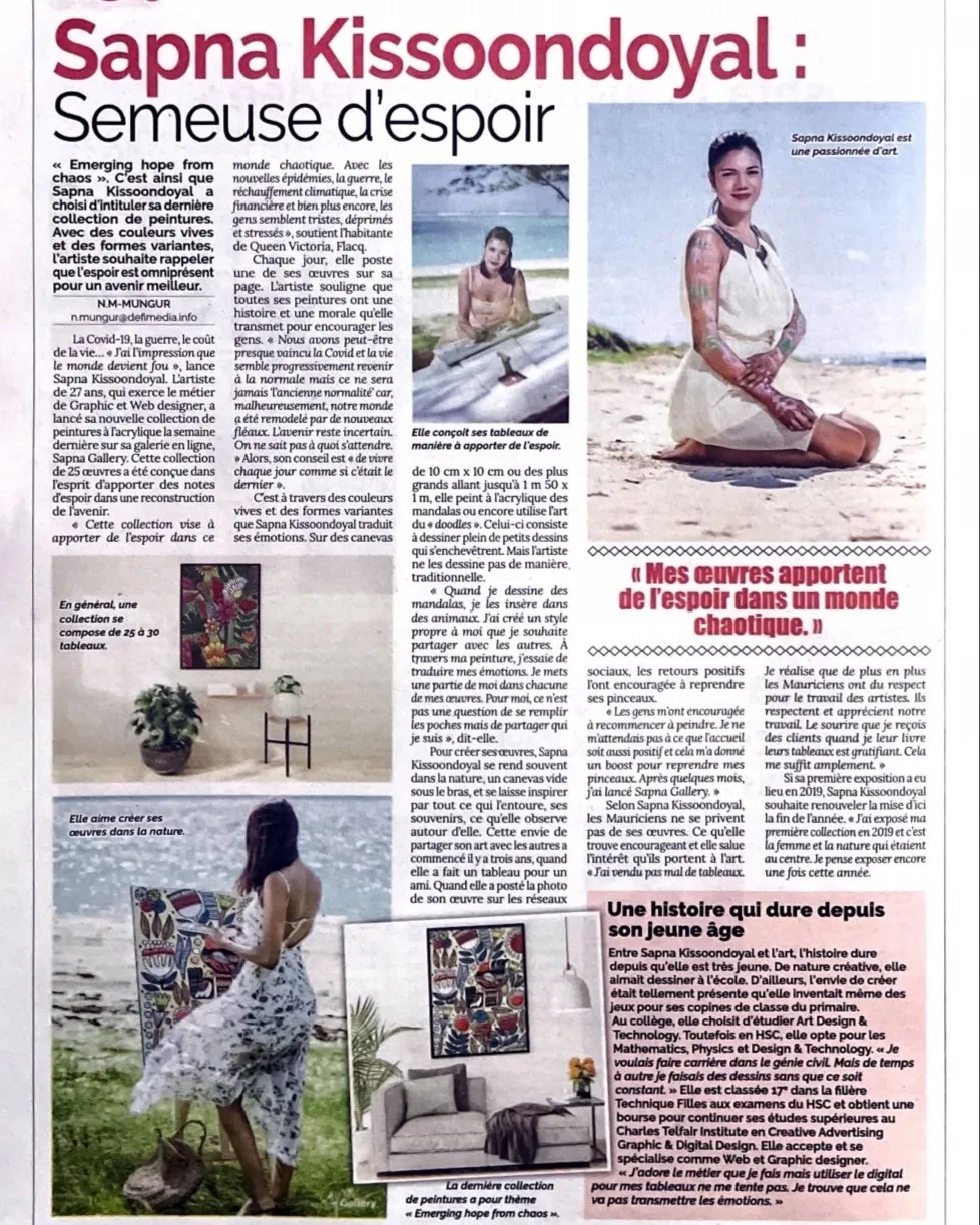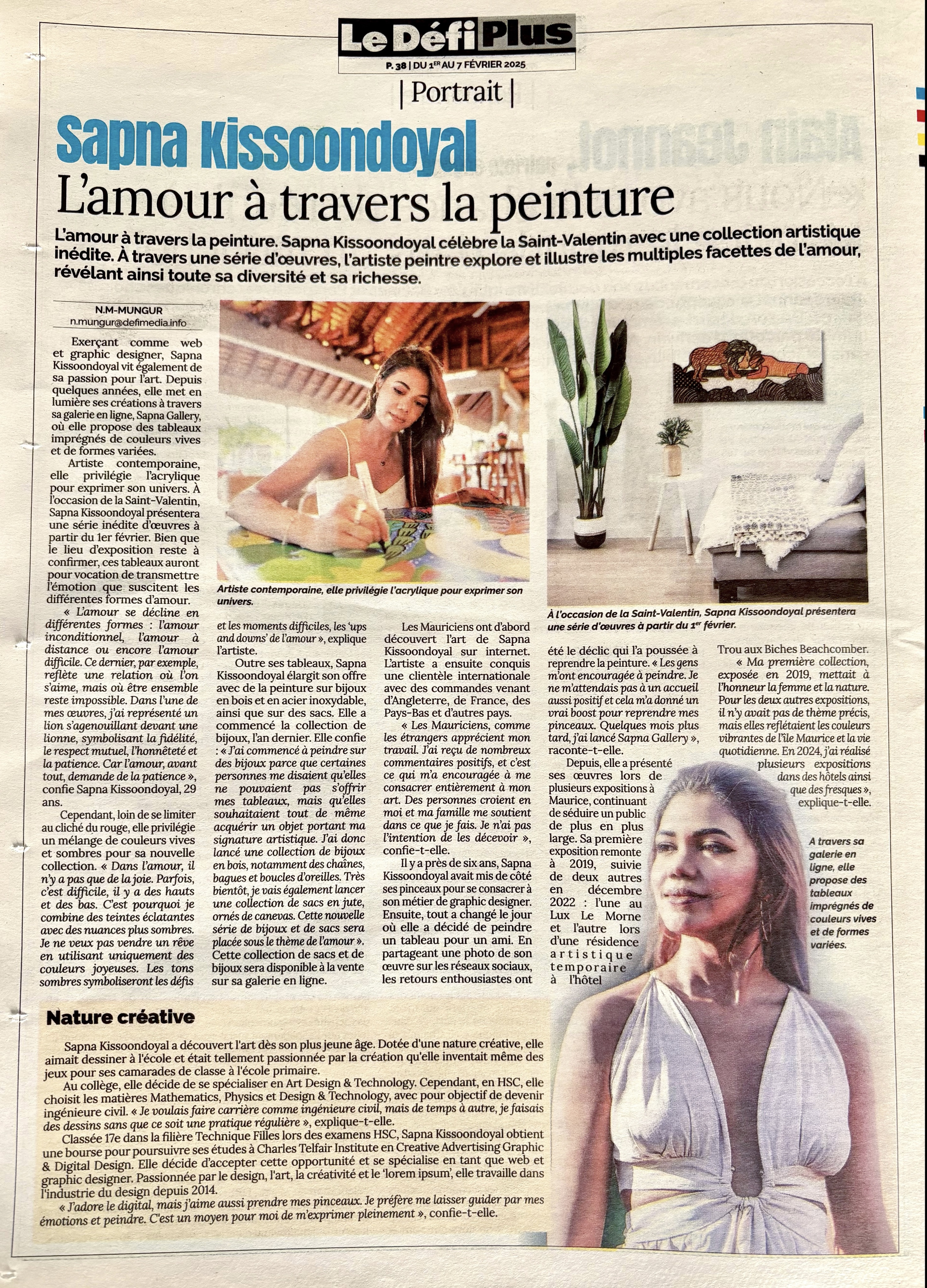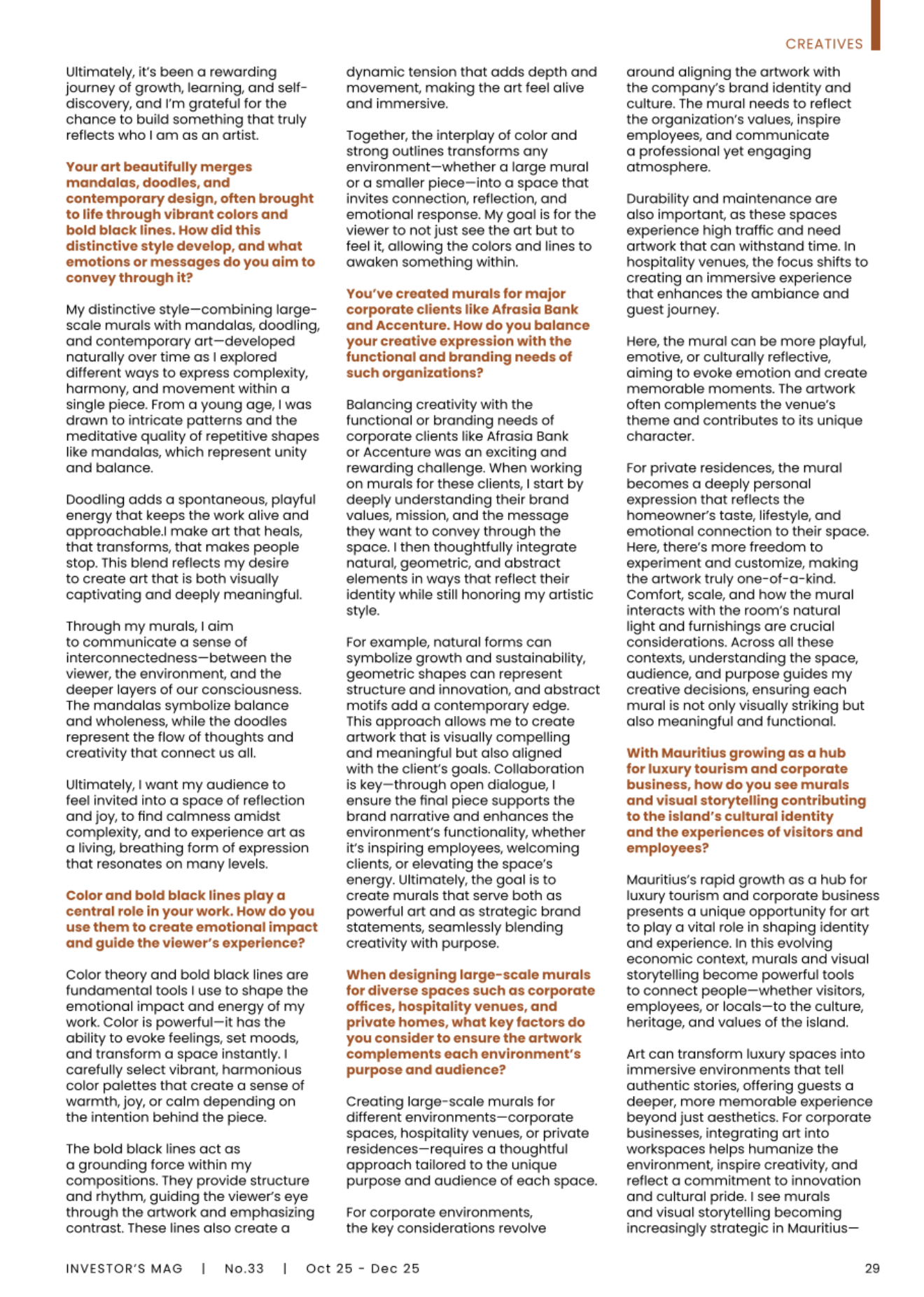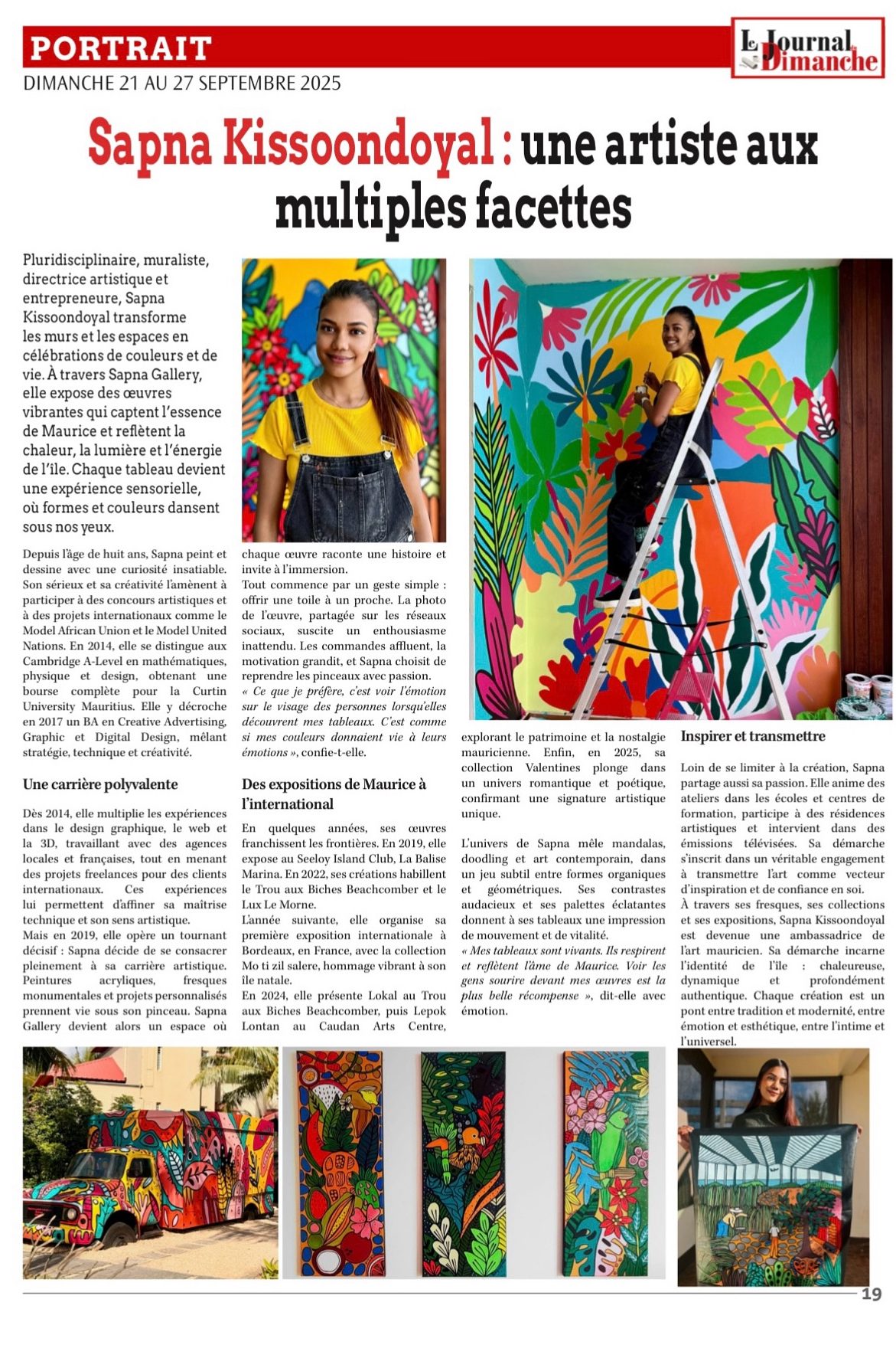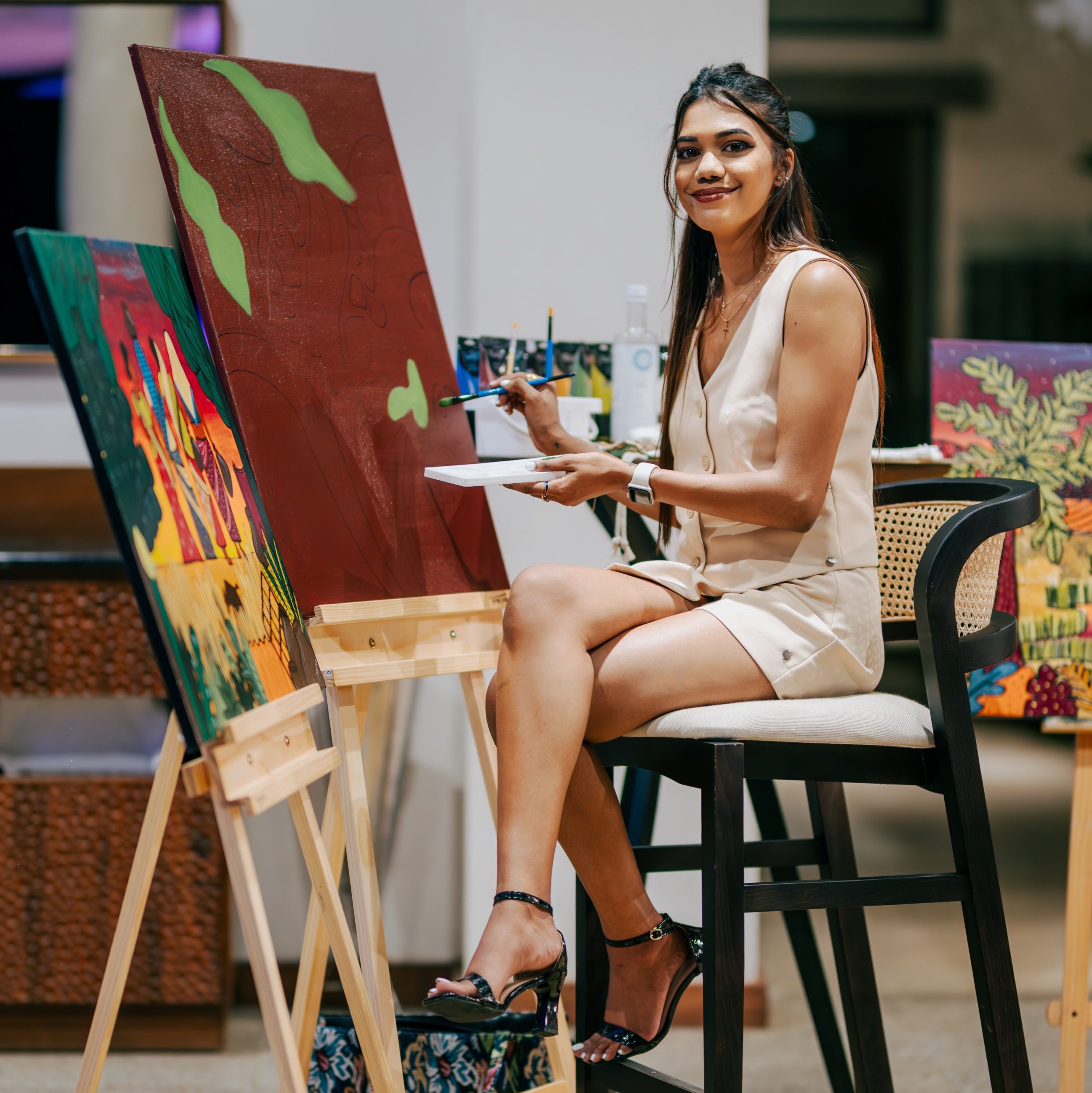 Today, I’m fortunate enough to live my dream through my acrylic paintings, murals, and illustrations. I offer design services, custom paintings, and workshops across Mauritius and internationally, constantly striving to bring positivity and vibrance to every space I touch. My work has been showcased in exhibitions in both Mauritius and France, where I’ve had the honor of sharing my artistic vision with diverse audiences.