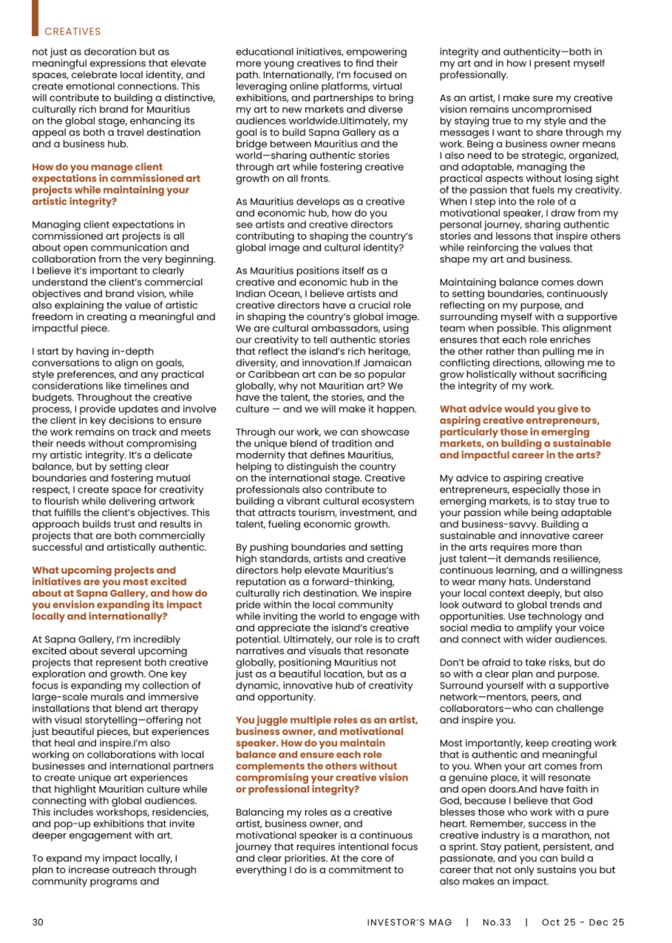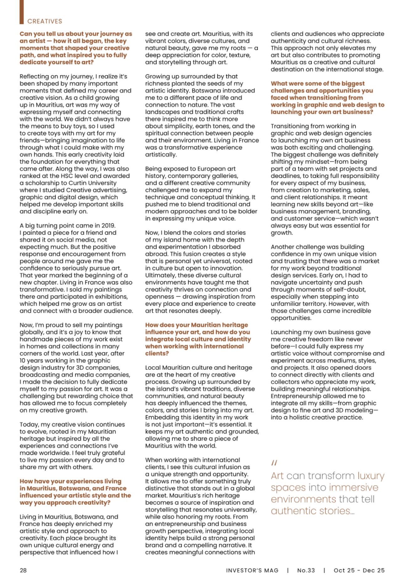 Pluridisciplinary Artist and Large Scale Muralist, Creative Art director and Entrepreneur from Mauritius since 2018.